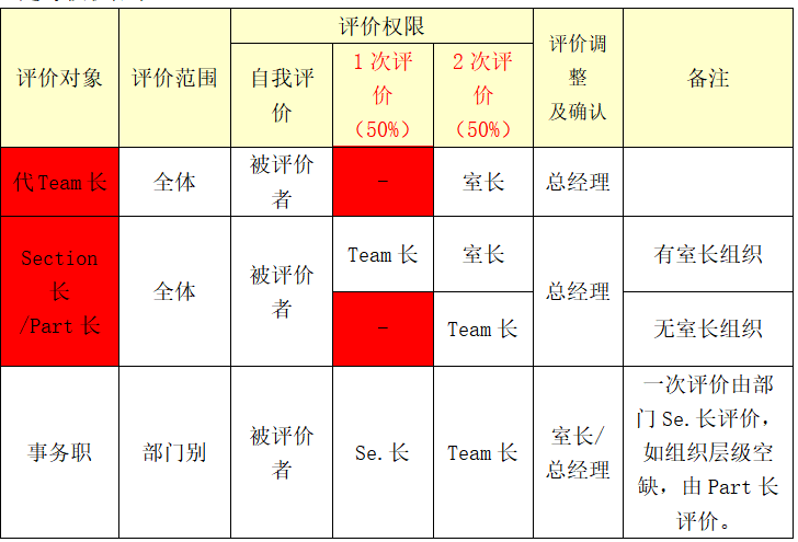 3>對全體事務職設置了不同層級的評價權限,使各關鍵崗位人員的被考核人員考核范圍鎖定在關鍵指標項,從而通過抓住主要少數而抓住主要問題,以下是考核權限表