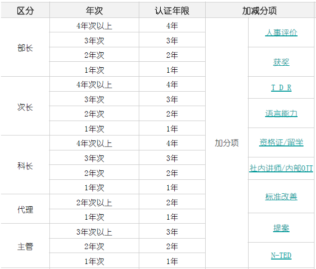 3.定義了七個職級的任職審核年限標準,每個職級劃分為1年、2年、3年、4年及4年以上的認證年限,并定義了每個職級的加減分項:人事評價、獲獎、TDR、語言能力、資格證/留學、社內講師/內部OJT、標準改善、提案、N-TED等方面的考核加減分項;對必要資格定義如下:革新學校結業(在職期間需通過1次即可),且為學校結課時排名為參與人員的前10%,加分處理為第1名:0.1分;第2名:0.05分;而科長升為次長:TOPIK需要2級以上;次長升部長:TOPIK需3級以上;附圖為任證年限標準: