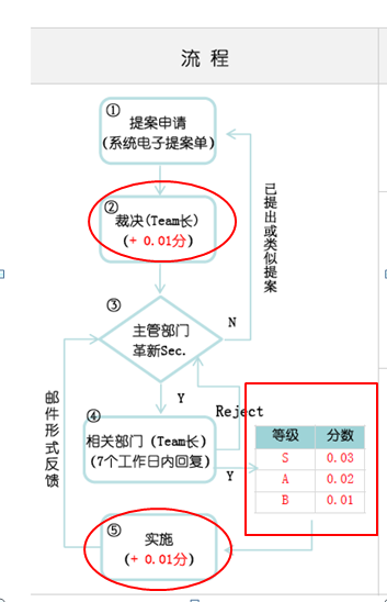 6.個人工作完成了,培訓的工作也做好了,那如何保證一個好的制度的傳承,不好的制度能及時修正與改正呢?下面關于晉升的的一個關鍵考核項目就是對之方面的一個強力保證,就是你關于制度的建議要有提案,要形成企業管理文件并歸檔,對企業制度的建立與完善要有貢獻,我們來看看該企業的提案流程與對應的晉升加分