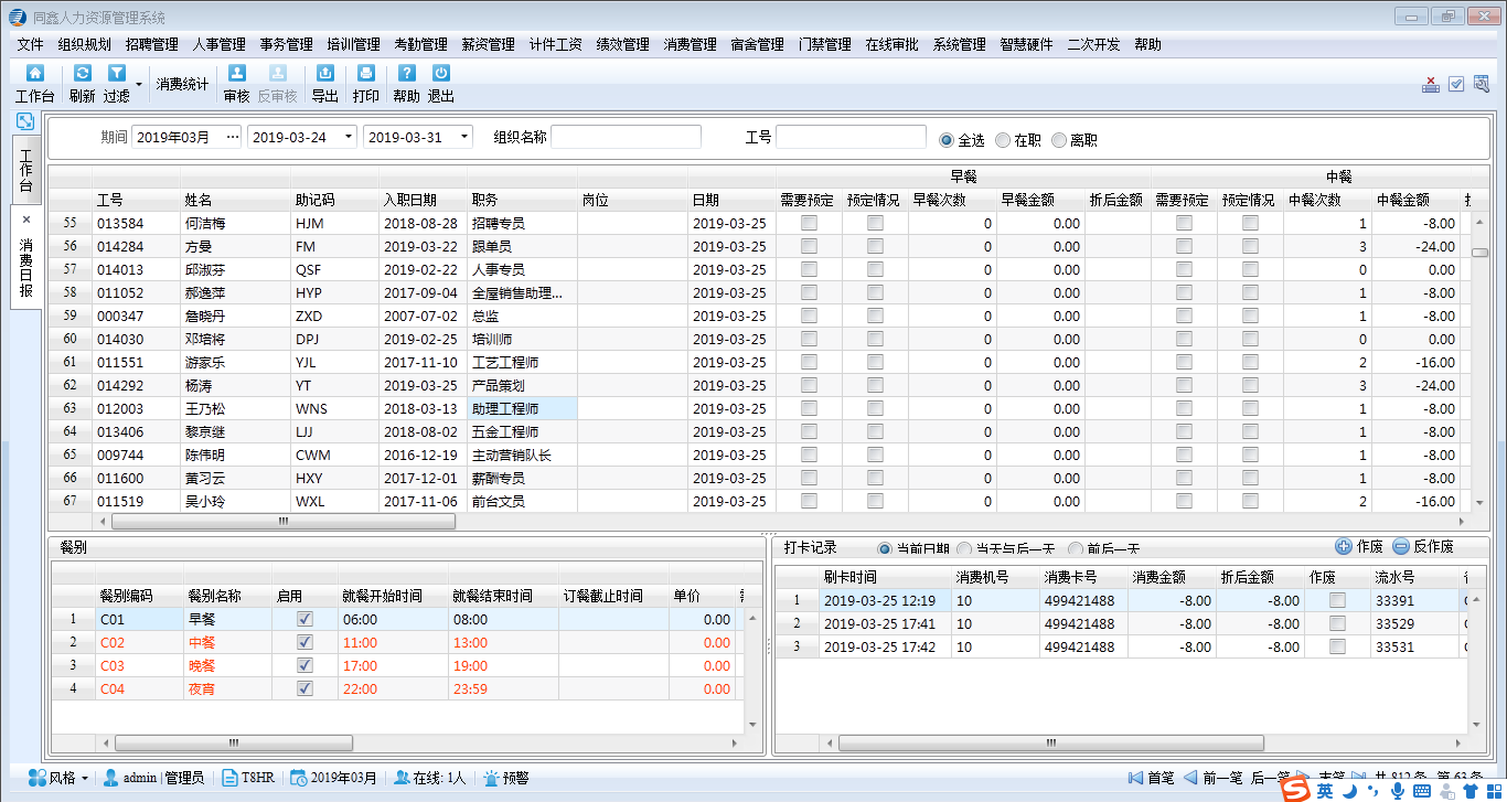 2.同鑫人力資源管理系統上線情況:上線模塊有,人事/事務/考勤/門禁/消費/報表等