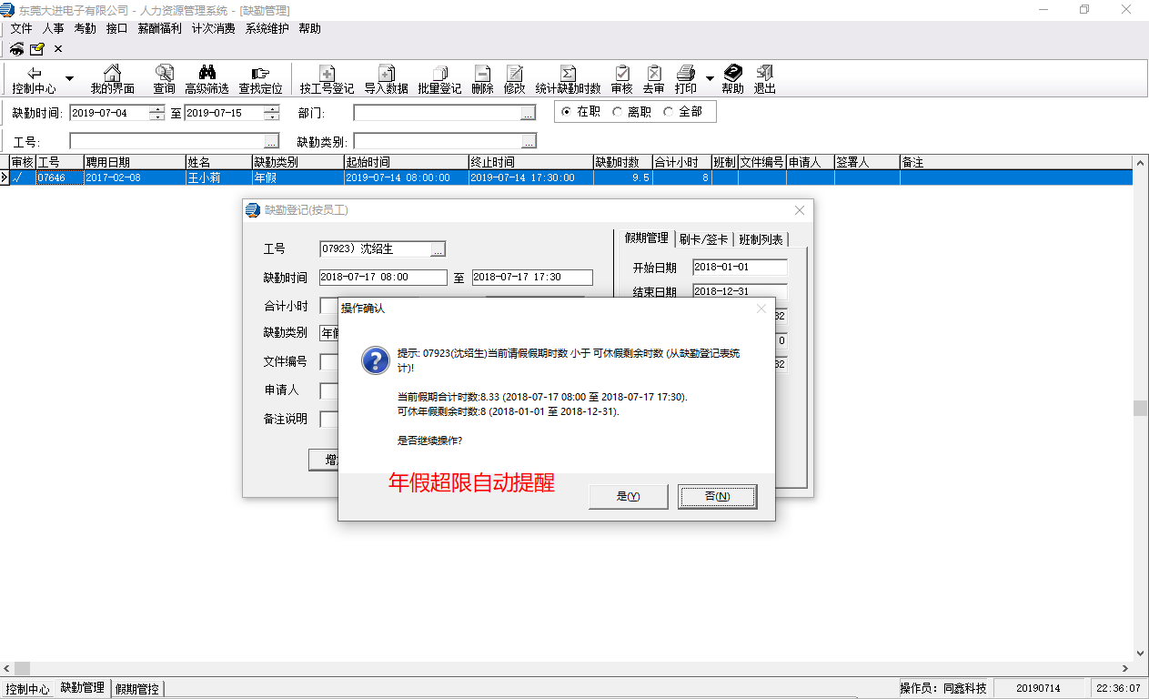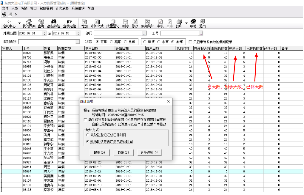 在同鑫HR系統(tǒng)的“假期管控”中,只需輕輕一點(diǎn)“假期統(tǒng)計(jì)”按鈕就可統(tǒng)計(jì)出員工的年休假了。其中,年假的統(tǒng)計(jì)開始日期和結(jié)束日期都是可以調(diào)整的,系統(tǒng)會(huì)自動(dòng)計(jì)算出該期間所有員工的總年假天數(shù)、已休天數(shù)、剩余天數(shù)。實(shí)時(shí)管控員工年假已休天數(shù)、剩余天數(shù),當(dāng)員工剩余年假天數(shù)不足時(shí),會(huì)彈出提醒框,省心省力。