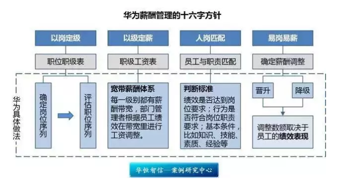 總體來講,可以用16個字來概括華為的薪酬管理:以崗定級、以級定薪、人崗匹配、易崗易薪。