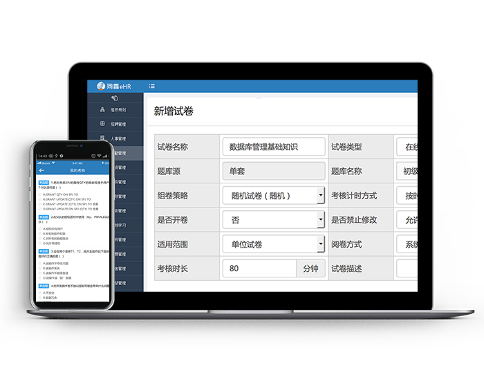 ● 支持各種類型的題庫的預設,可在系統中建立題庫;● 根據預設題庫與考試要求智能生成備選試卷(可打印、在線答題、移動推送);● 根據員工在線答題情況,自動計時,自動閱卷與人員評審相結合;● 可通過各種終端訪問考試答題情況,優化改進企業試題庫,完善人才選拔機制。